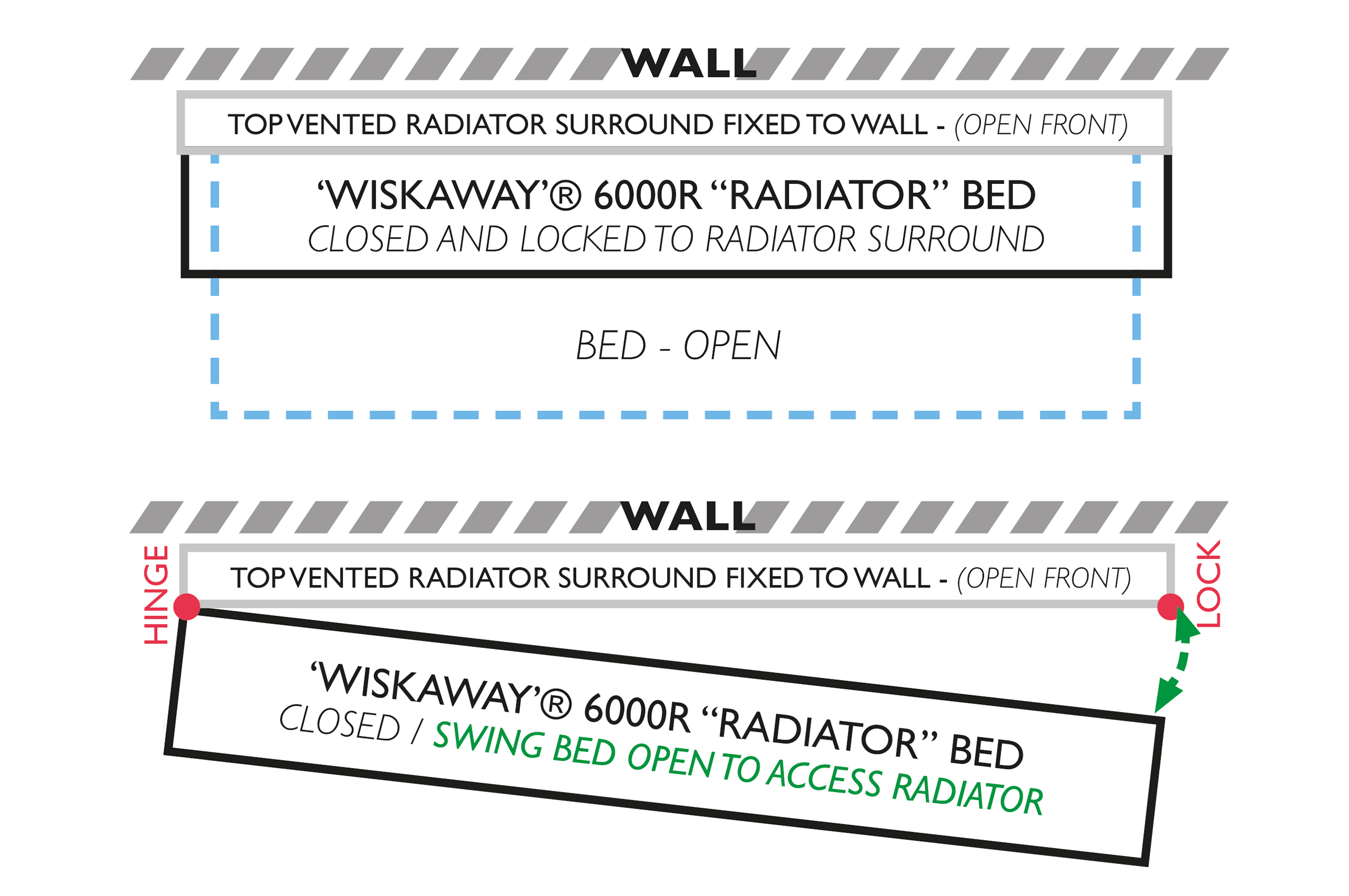 1) Our wallfixed, all-steel ‘Horizontal’ and ‘Vertical’ ‘WISKAWAY’® and ‘NEAT-A-WARD’® Wallbeds, which come in single, double and made-to-measure sizes and in a wide choice of bedframe colours and finishes for the wipe-clean housings and optional matching furniture and can be pivoted away complete with all the bedding, including the pillows (in just seconds in an emergency).