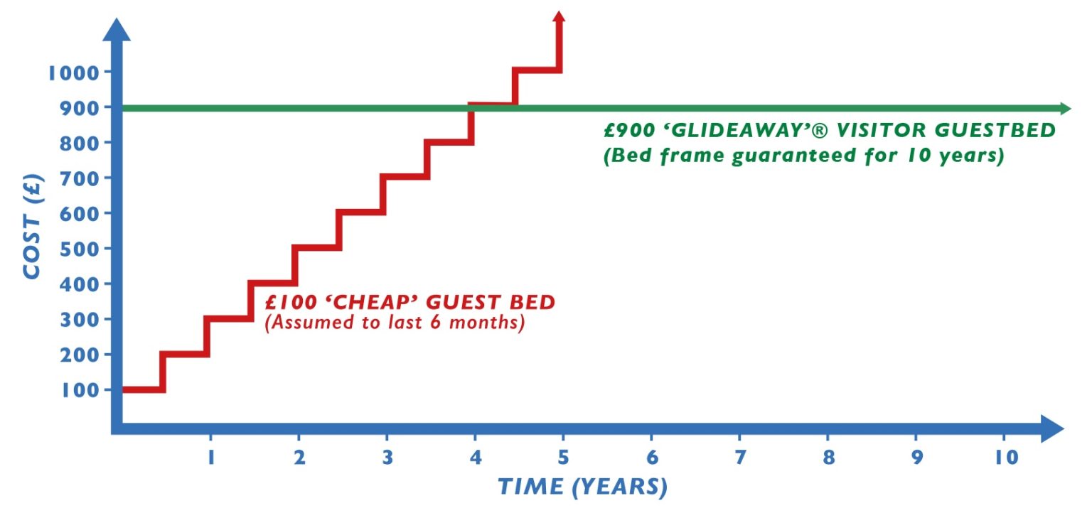 When costed over its impressively long service life, the ‘GLIDEAWAY’® works out, not just cheaper, but FAR cheaper, than so-called ‘cheap’ guest beds, costed over the same period – see the graph below. SO CHOOSING THE ‘GLIDEAWAY’® REALLY IS A ‘NO-BRAINER’.